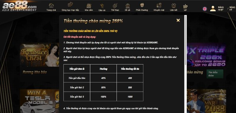 AE888 chào mừng tân thủ bằng ưu đãi tặng 288%