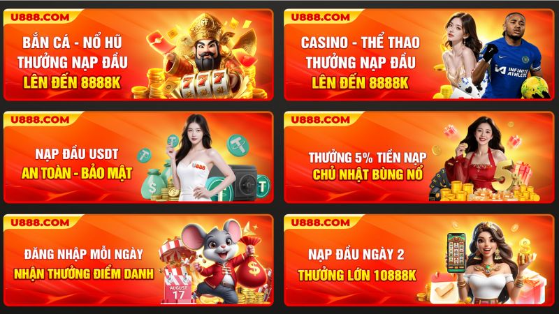 Ngoài phần quà chào mừng, U888 còn mang đến một hệ sinh thái khuyến mãi vô cùng phong phú và giá trị. Khi trở thành thành viên, bạn sẽ có cơ hội tham gia các chương trình đặc sắc sau: